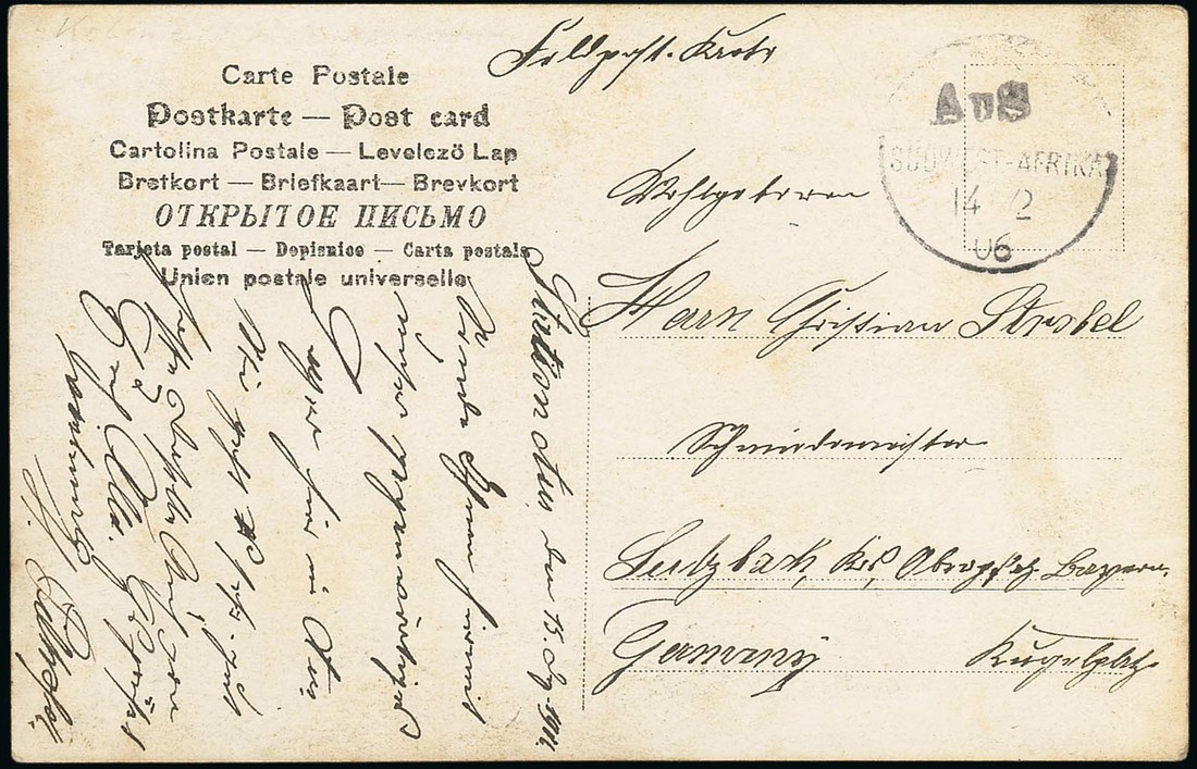 Aus: 1906 (14 Dec.) Feld picture postcard to Germany with black "AuS"; a trifle soiled, fine. Putzel A2a. Photo