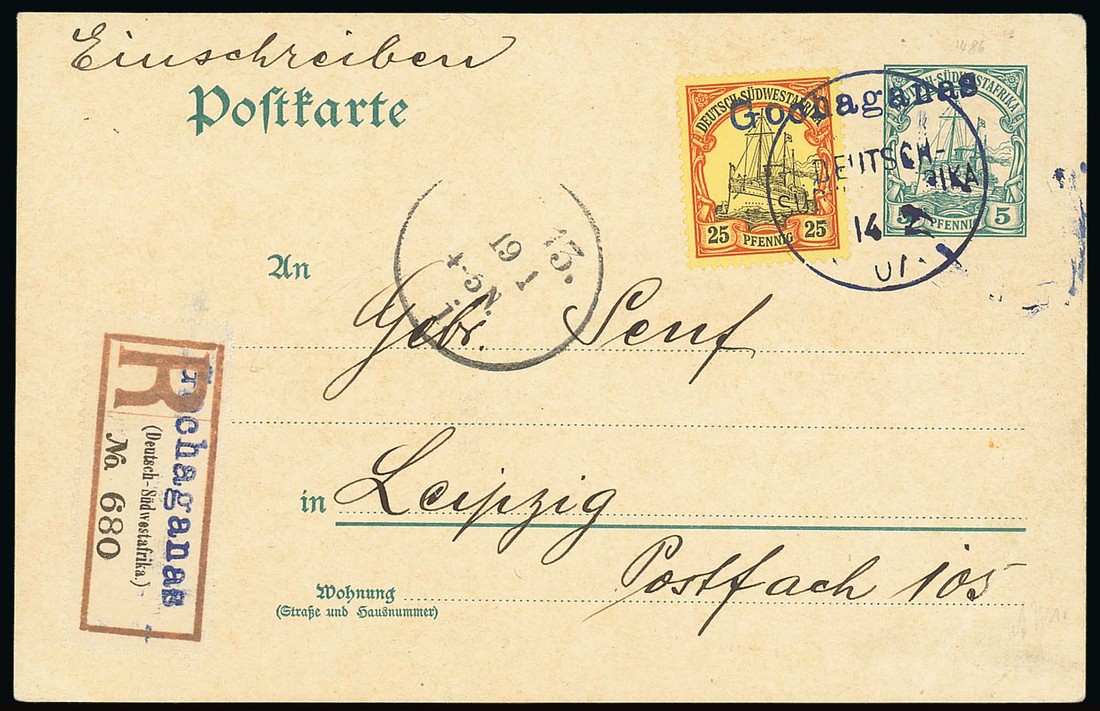 Gochaganas: 1907 (14 Feb.) 5pf. postal stationery card, additionally franked 25pf., registered to Leipzig, with single blue datestamp and "Gochaganas", another strike of the registration etiquette; fine and rare. Putzel A1 and illustrated on page 53 of the handbook. Photo