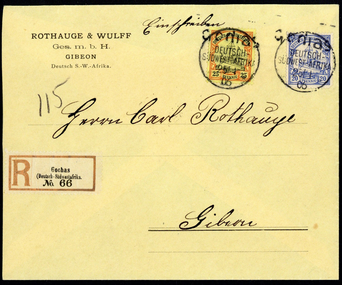 Gochas: 1906 (25 Jan.) envelope registered to Gibeon, franked 1901 20pf., 25pf. with two black datestamps and two "Gochas" handstamps, arrival d.s. on reverse; fine. Putzel A3. Photo