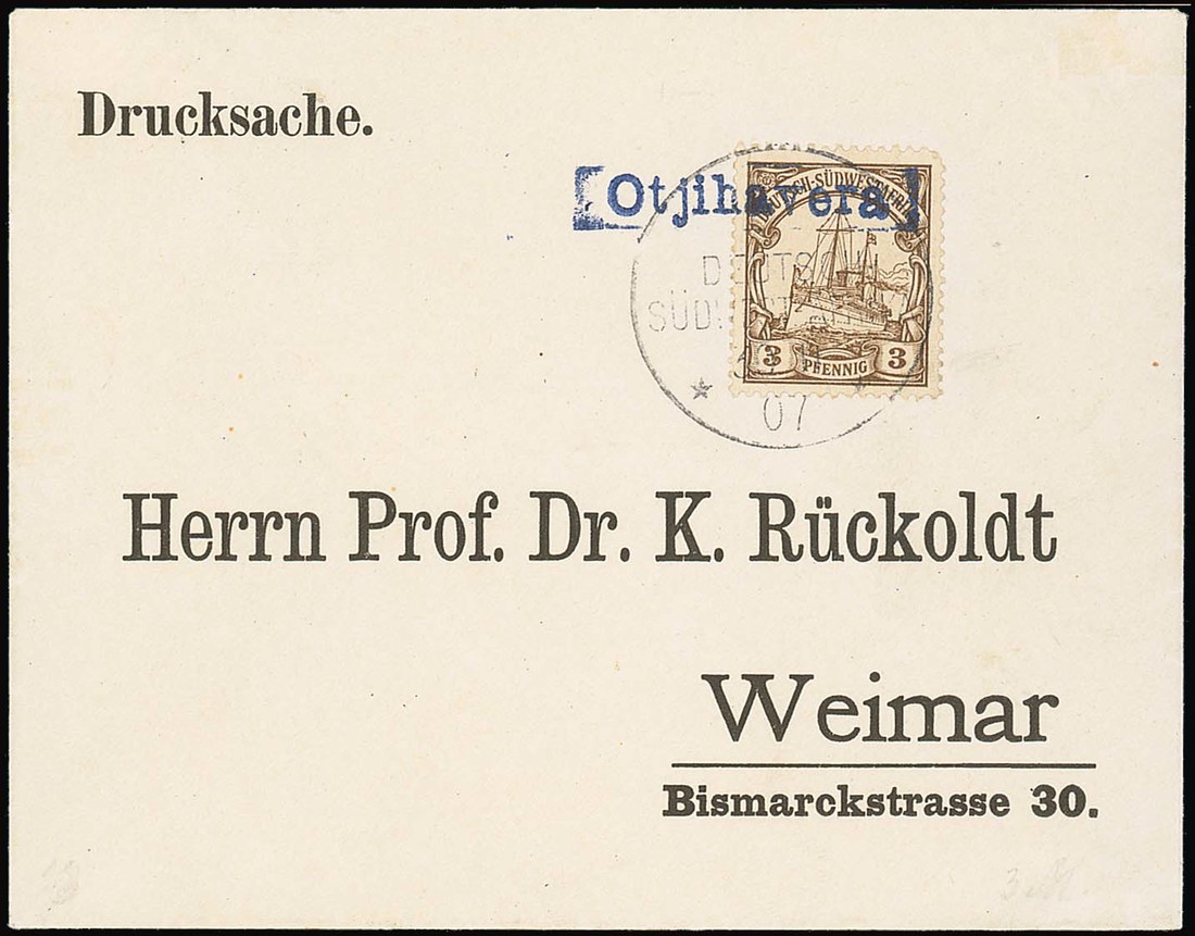 Otjihawera: 1907 (30 Nov.) printed matter envelope to Weimar, franked 1901 3pf. with black datestamp and blue "Otjihavera"; fine and rare. Putzel A1. Photo