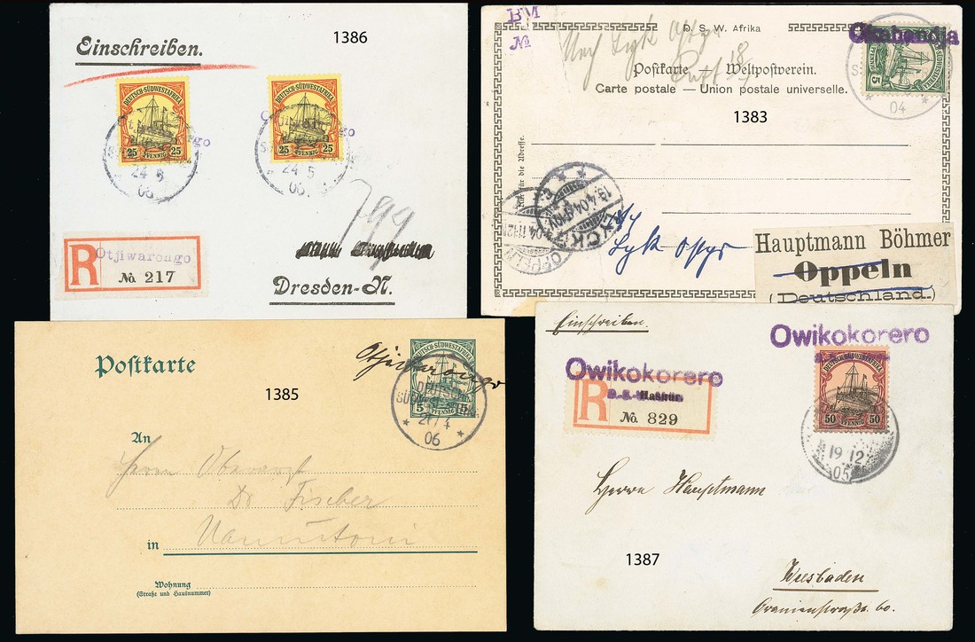 Otjiwarongo: 1906 (24 May) envelope registered to Dresden, franked 1901 25pf. (2) with black datestamps, two violet "Otjiwarongo" handstamps and with registration etiquette with the same "Otjiwarongo" handstamp, arrival d.s. on reverse; addressees name crossed through, otherwise fine. Putzel A1. Photo
