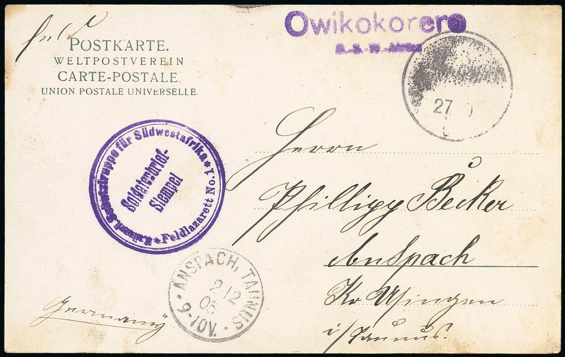 Owikokorero: 1915 (27 Oct.) Feld picture postcard to Anspach with negative datestamp, violet "Owikokorero/d.w.s.afrika" and military cachet in the same colour, arrival d.s. on the front; a trifle soiled, fine. Putzel A2. Photo