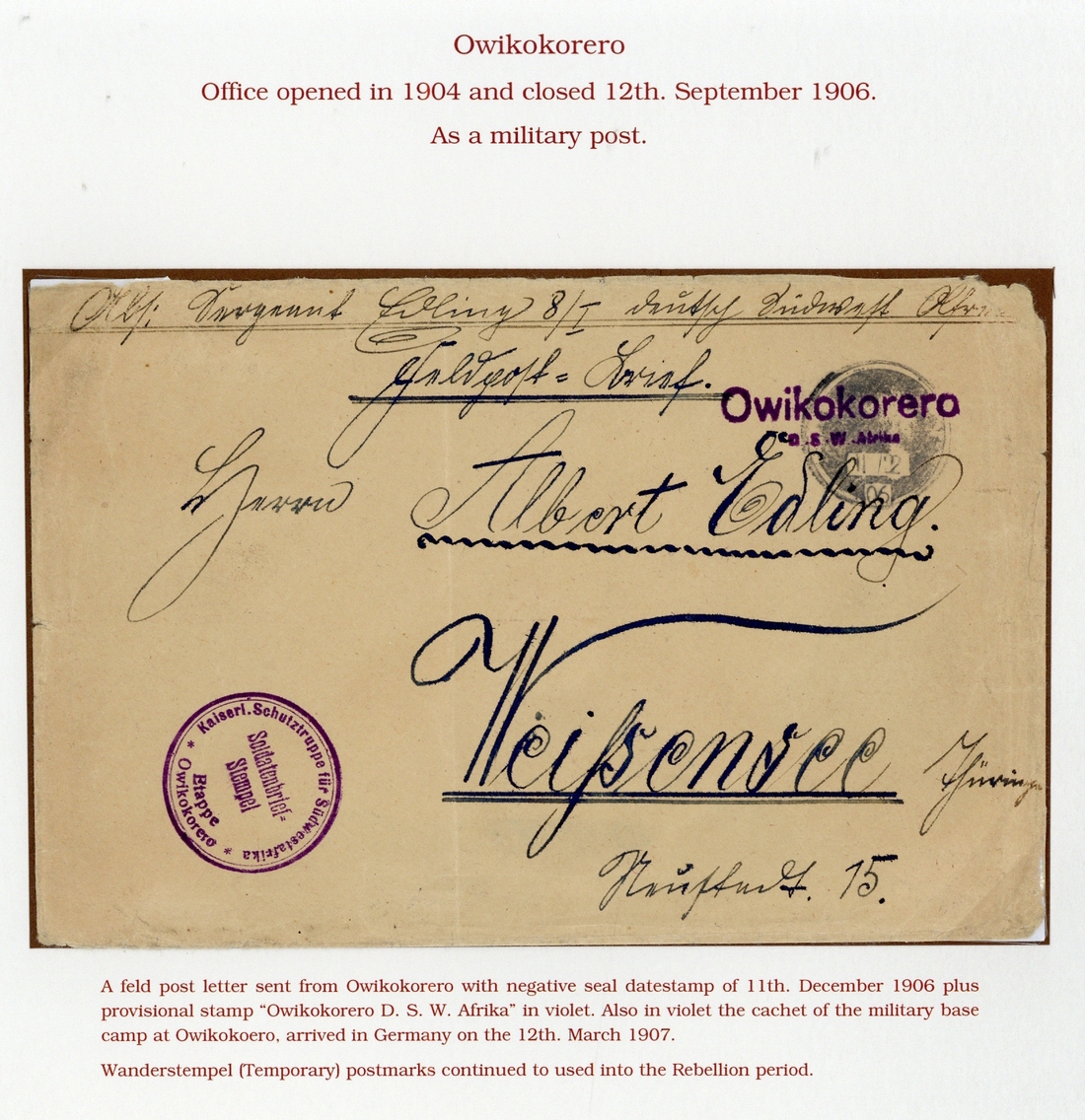 Owikokorero: 1906 (22 Nov.) Feldpost envelope to Germany with negative seal datestamp and violet "Owikokorero/d.s.w. afrika" handstamp, violet military cachet on the front and arrival d.s. on reverse; the envelope with a few small perimeter faults. Putzel A2