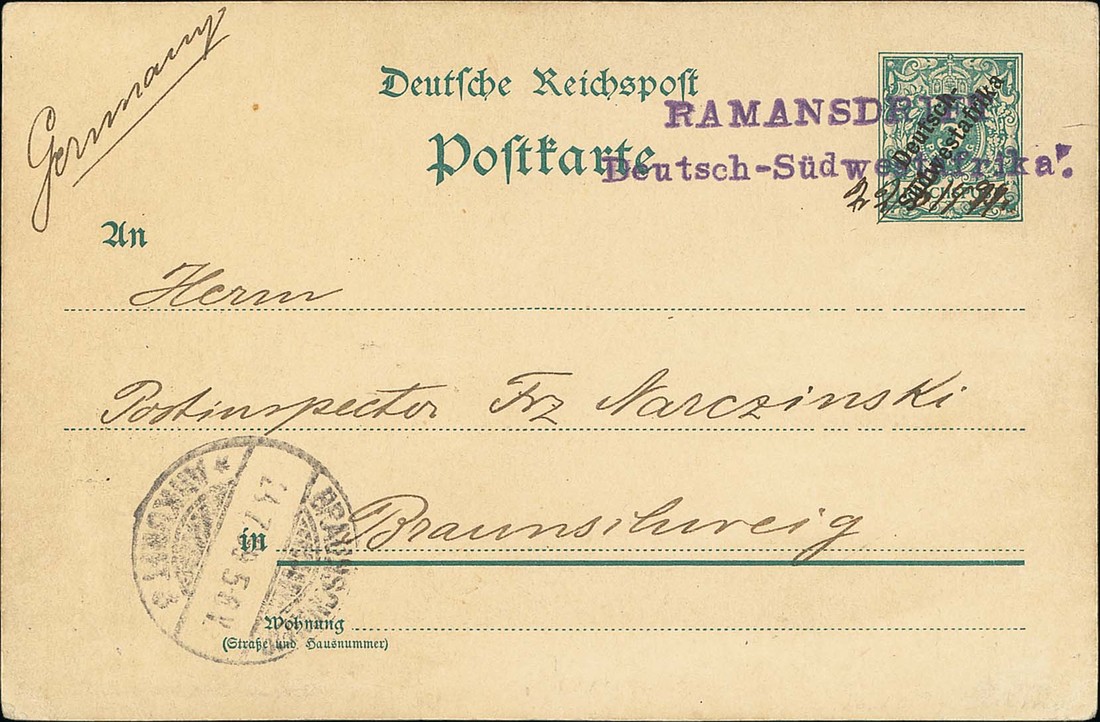 Ramansdrift: 1899 (22 June) 5pf. "Südwestafrika" postal stationery card to Braunschweig with violet "ramansdrift/Deutsch-Südwestafrika" and manuscript date; superb and extremely rare. Putzel A1 and illustrated on page 107 of the handbook. Photo