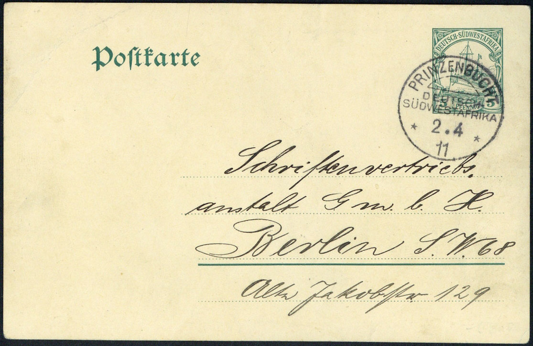 Prinzenbucht: 1911 (2 April) 5pf. stationery card to Berlin, "prinzenbucht/deutsch-südwestafrika" cancellation; fine and scarce. Putzel A1. Signed Dr. Steuer, Czimmek