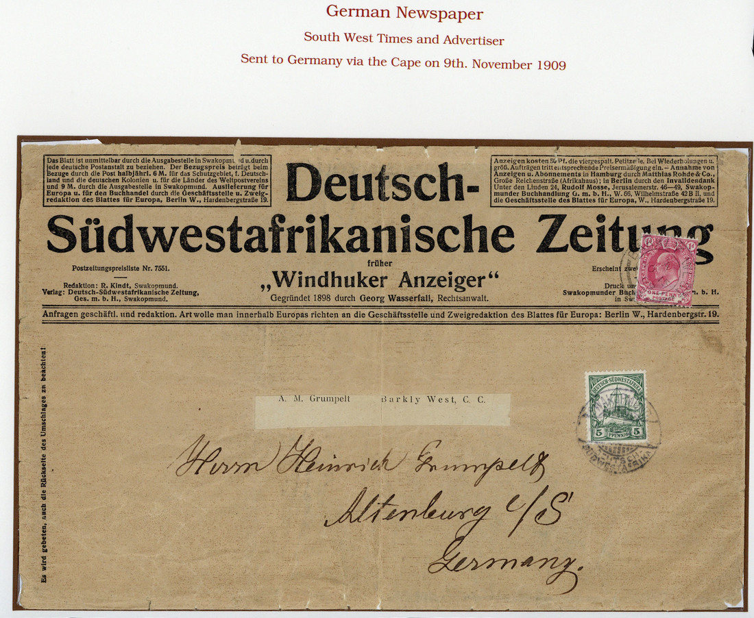 Swakopmund: 1909 (9 Nov.) Newspaper wrapper for "Deutsch-Südwestafrikanische Zeitung", to Germany, bearing 1901 5pf. with Swiss Bridge Swakopmund cancellation and Cape of Good Hope 1d. with Barkly West cancellation; minor creases and faults, scarce. Putzel A4