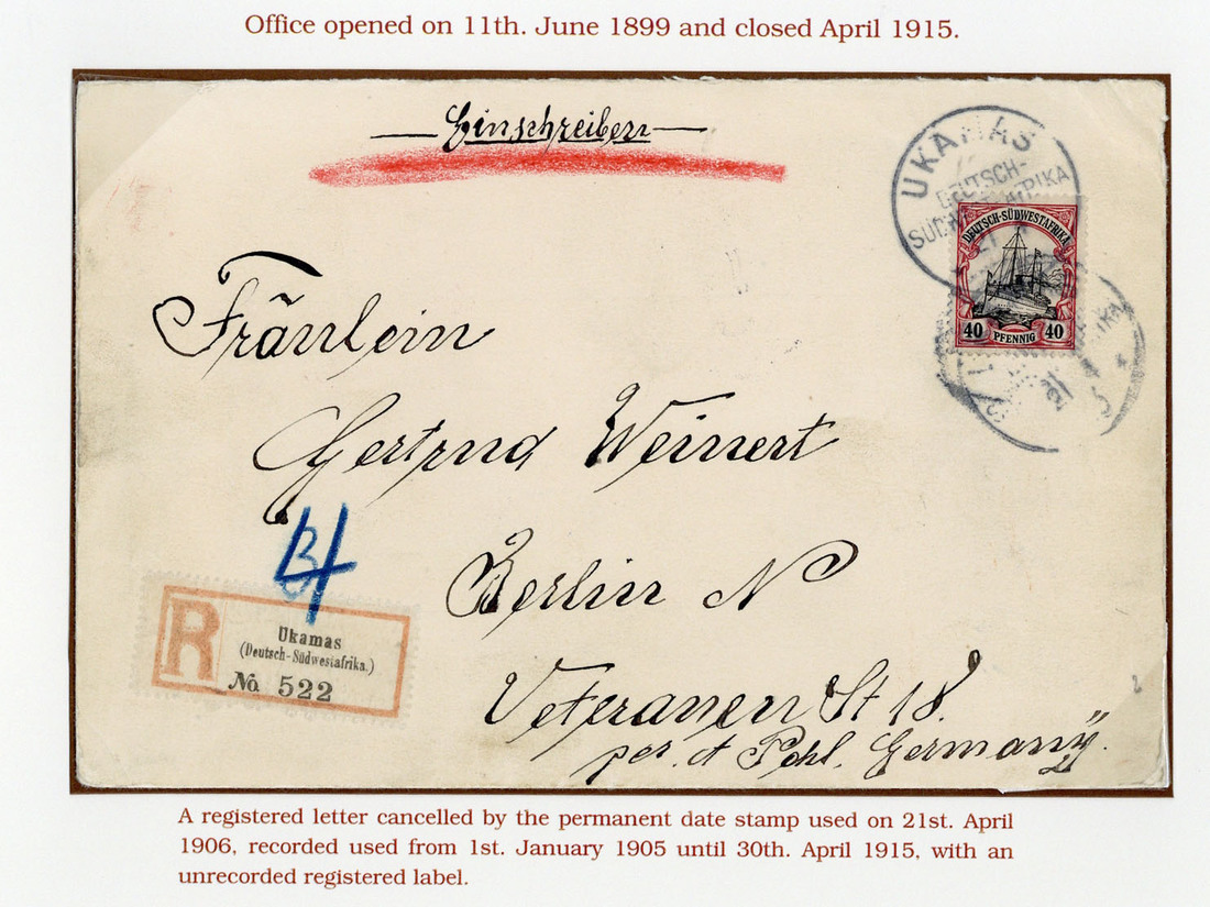 Ukamas: 1906 (21 April) envelope registered to Berlin franked 1901 40pf. with "ukamas/deutsche-/südwestafrika" cancellation and Ukamas/(Deutsch-Südwestafrika) registration etiquette, arrival d.s. on reverse; fine. Putzel A1b