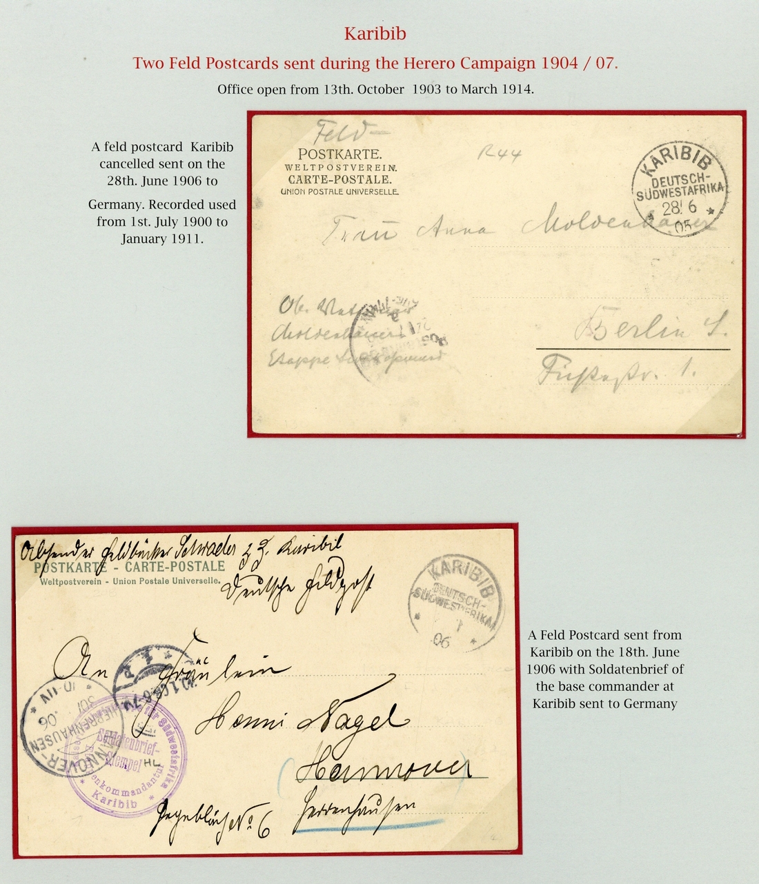 Selection of twelve cards and three envelopes with Town markings, including Gibeon, Gobabis, Karibib, Keetmanshoop, Maltahone, Otavi, Ramansdrift, Swakopmund, Windhuk, etc., many with violet Military cachets; mixed condition