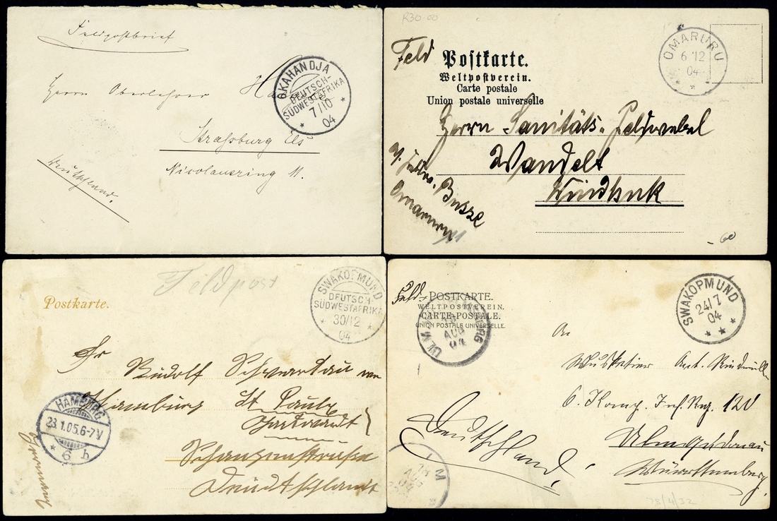 1904, four cards and two envelopes, all stampless and with different Town datestamps, Okahandja, Omaruru, Swakopmund (2 types), Waterberg and Windhuk, good to fine