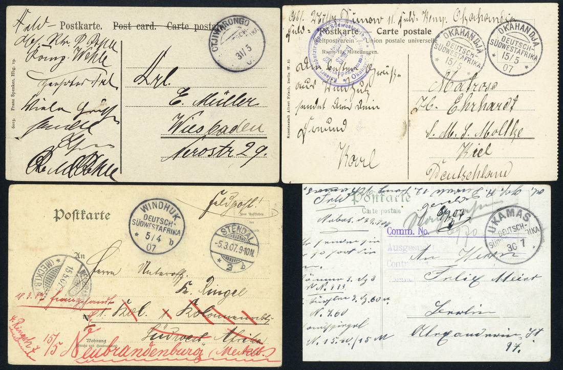 1907-13, five cards and two cards with different Town datestamps, Kub, Okahandja, Otavi, Otjiwarongo, Ukamas, Windhuk (2 types), two with violet military cachets, good to fine