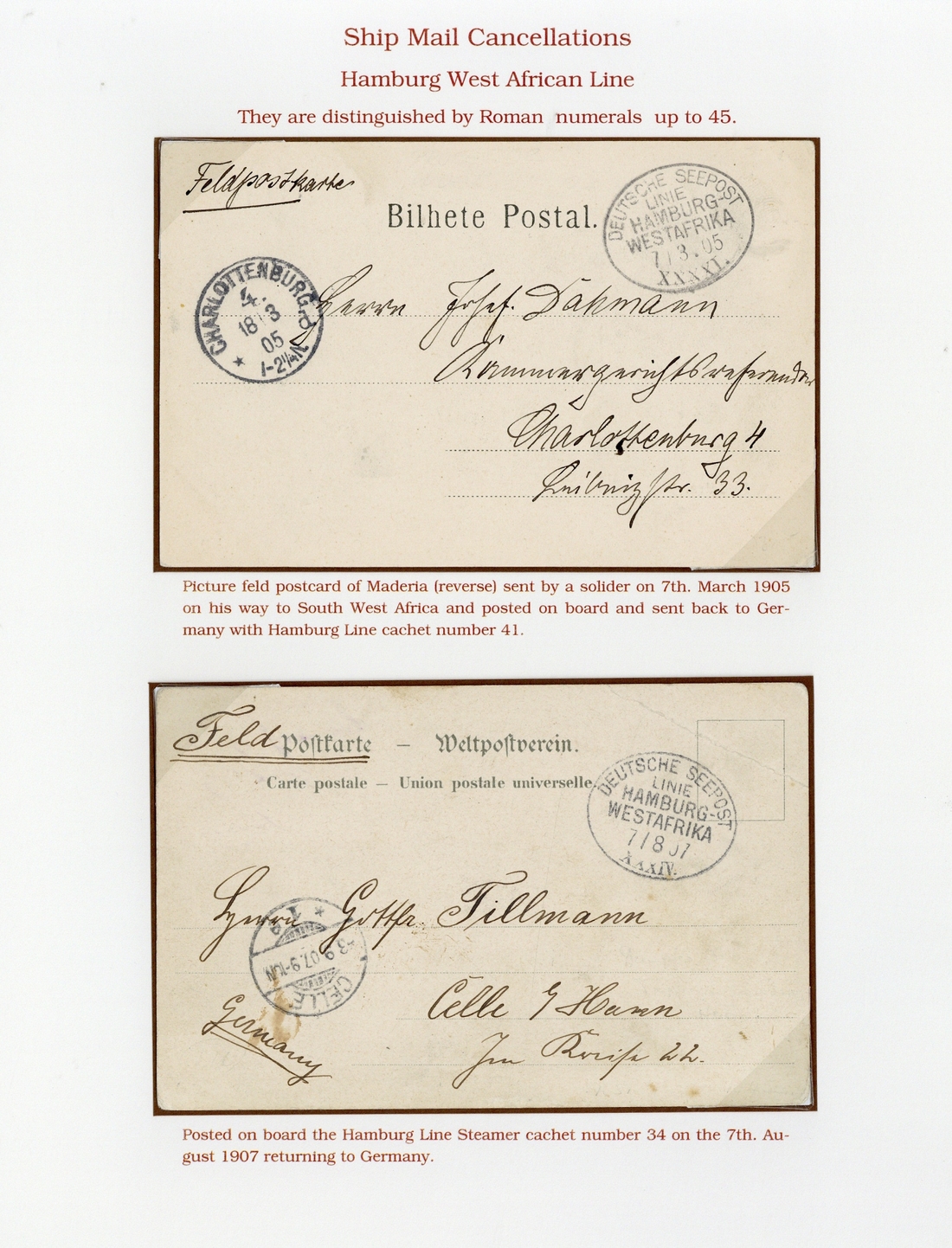 1891-1907 envelope and six cards, including 1891 envelope to Berlin franked 20pf. with framed "aus/westafrika", 1904 and 1905 postcards with "kais deutsche/marine/schiffpost/no. 65", 1905-07 postcards with oval "deutsche seepost/linie/hamburg-/westafrika/xxxiv" or "xxxxi", two cards with "Deutsches/Schutzgebiet" cachets, etc., good to fine