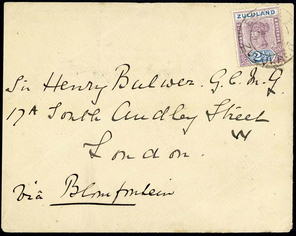 1897 (13 Dec.) envelope from Eshowe "via Bloemfontein" to Sir Henry Bulwer at London, bearing 2½d. dull carmine and blue with double-ring datestamp, Durban (14.12) and London (8.1) c.d.s. on reverse; not apparently routed via Bloemfontein as it does not have the extra 2d. postage required for this route
