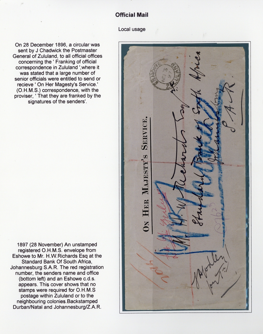 1897 (28 Nov.) unstamped OHMS envelope (217x101mm.) registered from Eshowe to Mr. H.W. Richards of the Standard Bank in Johannesburg and redirected in blue crayon to Mr. Thomas, showing double-ring datestamp and, on reverse, Durban (4.11) and arrival (6.11) c.d.s.