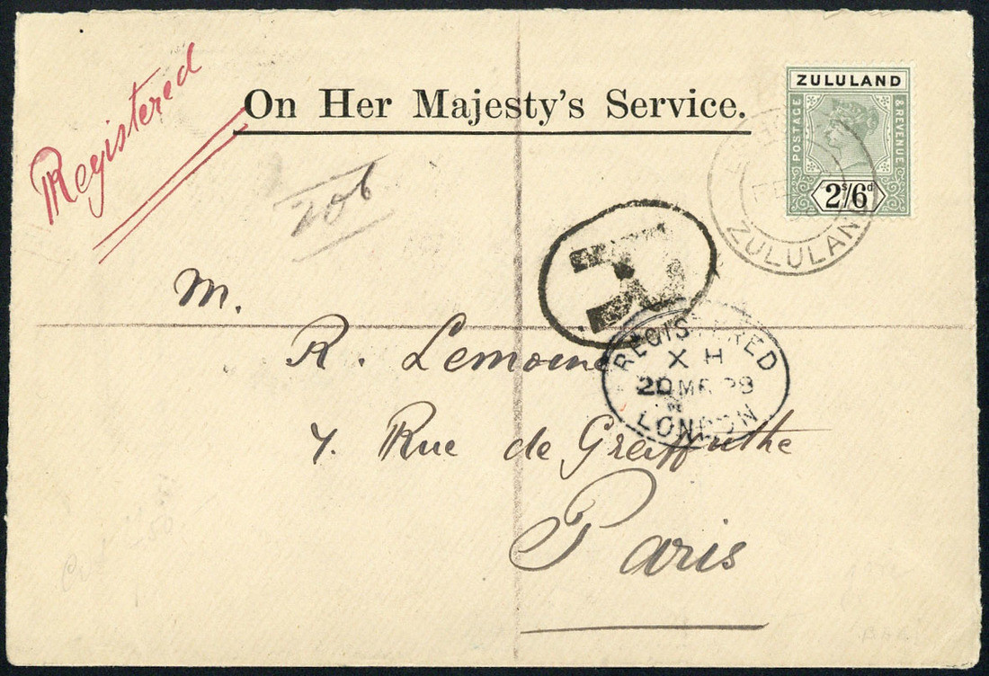1898 (22 Feb.) OHMS envelope (opened-out) registered from Eshowe to Paris, bearing 2/6d. green and black neatly cancelled by double-ring datestamp and showing oval-framed "R" and London Registered oval datestamp (20.3) alongside, Durban (23.2) and Paris (21.3) c.d.s. on reverse; fine and a scarce stamp used on cover. Photo