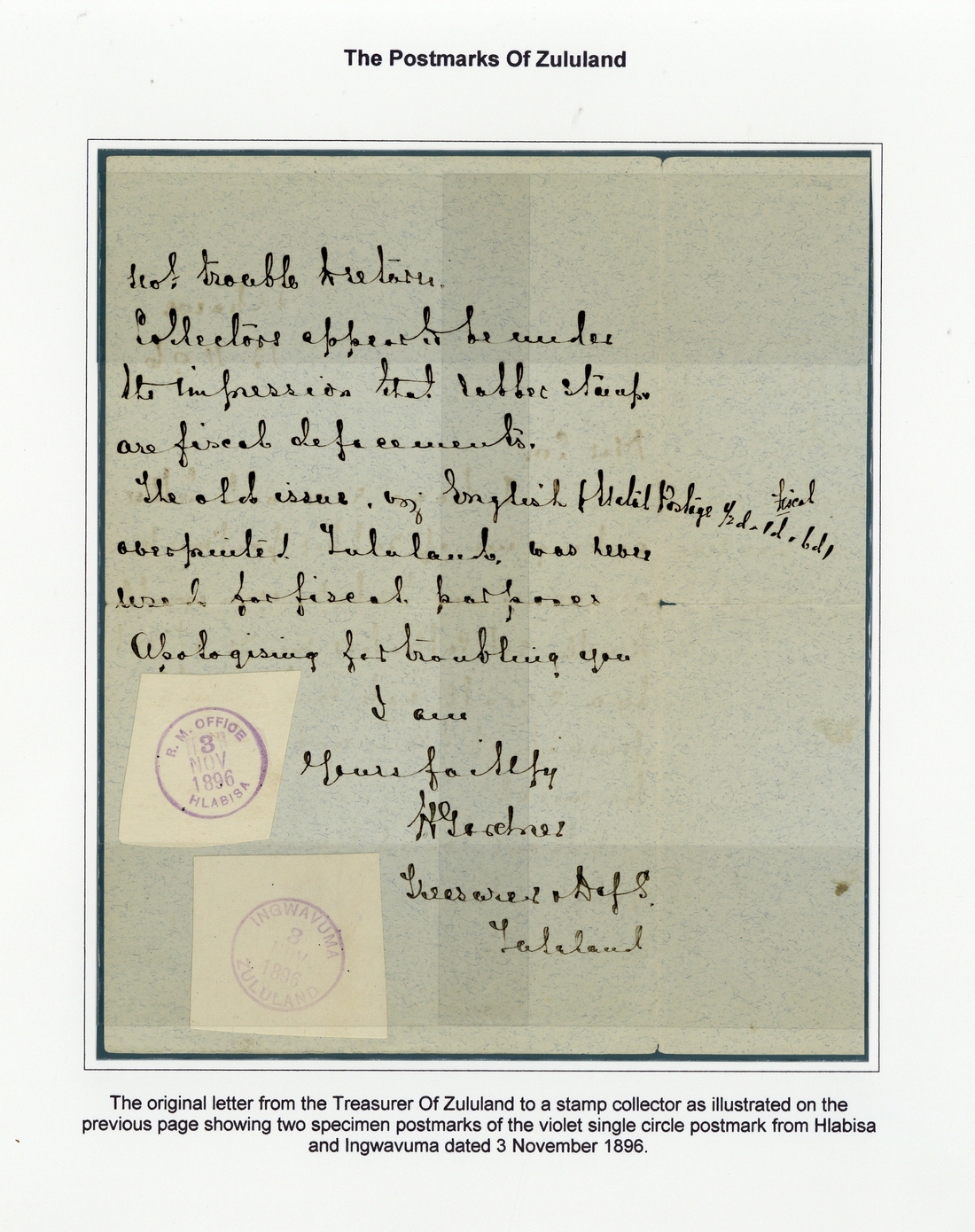 1896 letter from Treasurer Mr. H. Gardner to a collector clarifying the issue regarding the use of rubber datestamps and confirming that these were used for postal purposes and not for fiscal use, the second page bearing examples for Hlabisa and Ingwavuma struck on small pieces and affixed alongside Gardner's signature