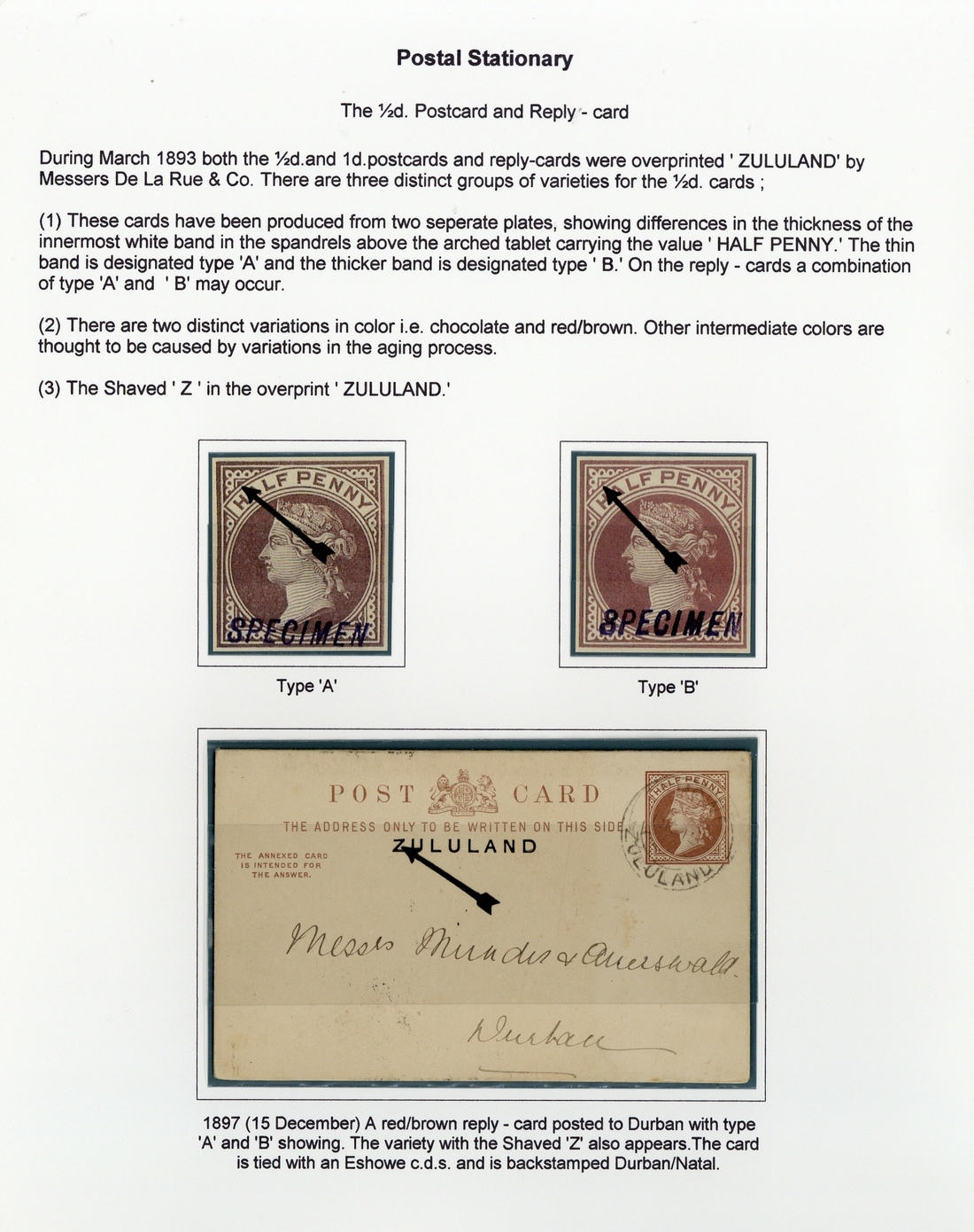 ½d. selection all used from Eshowe, comprising 1893 (June) addressed locally to the Resident Magistrate with the writer commenting on having shot a turkey buzzard in terms of a permit granted to him, 1894 (Sept.) addressed locally and cancelled by unusual "legal advisors office/zululand" oval datestamp in violet, 1895 (Apr.) with shaved "Z" variety and addressed to Natal, 1897 (Nov. (corner fault) uprated with ½d. to London with pre-printed Christmas Greetings and 1897 (Dec.) reply type with shaved "Z" to Durban