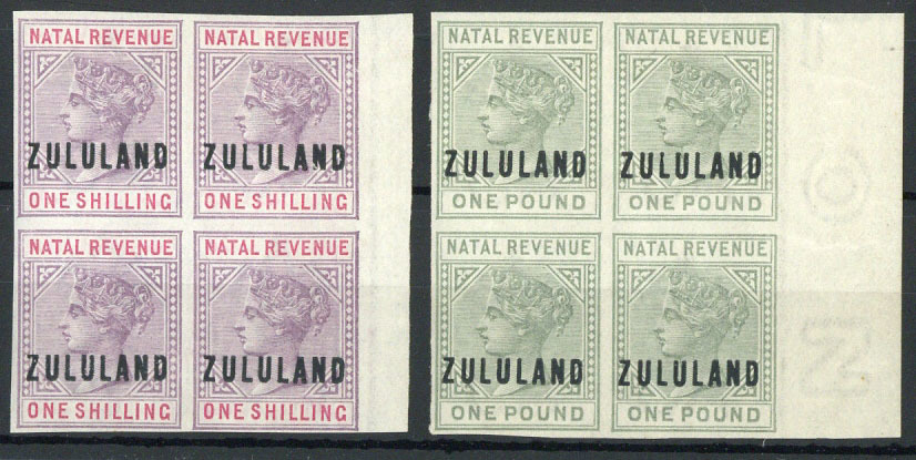 1/- and £1 imperforate marginal blocks of four on gummed paper; both with a vertical crease, otherwise fine