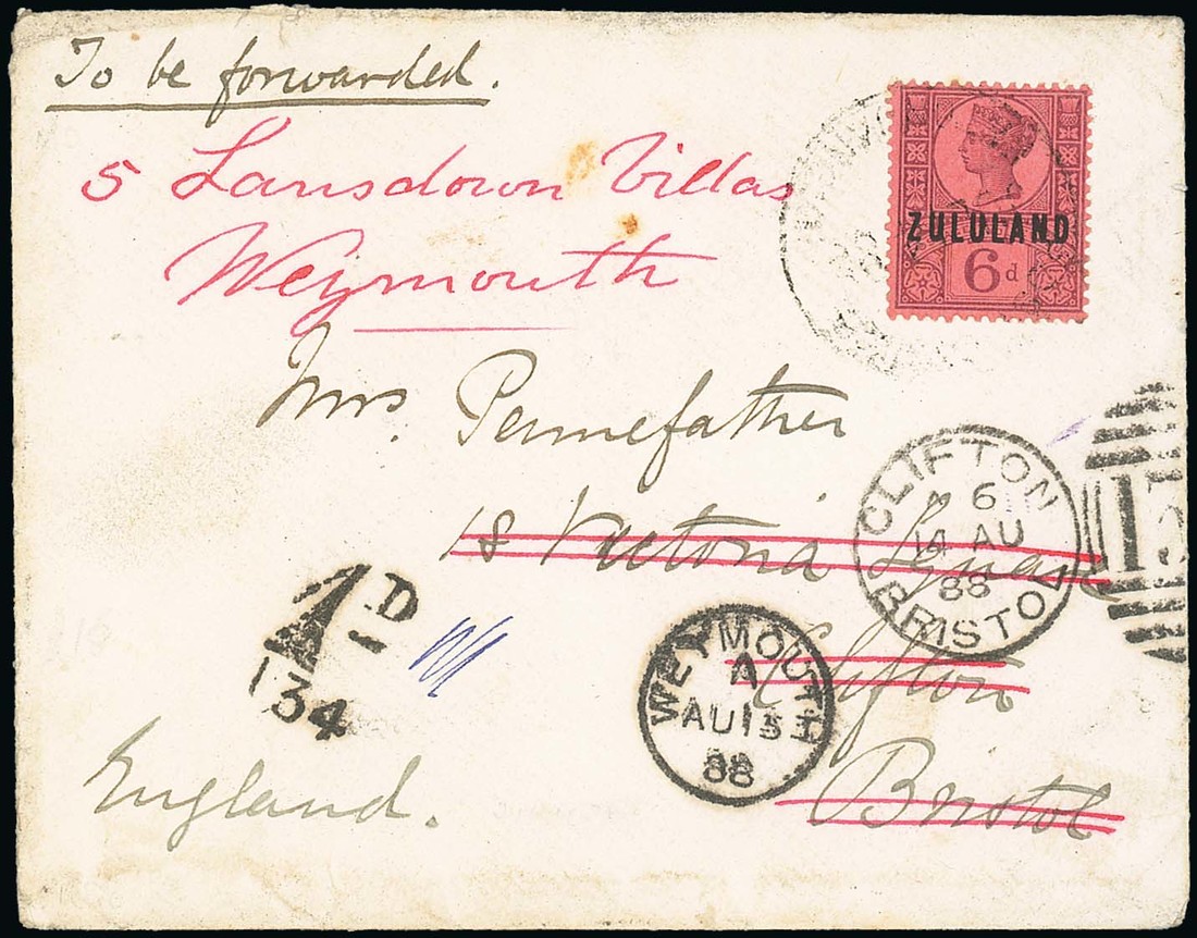 1888 (17 July) envelope from E.J. Pennefather to Bristol and redirected to Weymouth, bearing 6d. with light c.d.s. and showing "1d/134" redirection fee handstamp, part Clifton duplex (14.8) and Weymouth (15.8) c.d.s., the reverse (torn flap on opening) showing Eshowe c.d.s. in violet and four transit c.d.s.; an early letter from this office. Photo