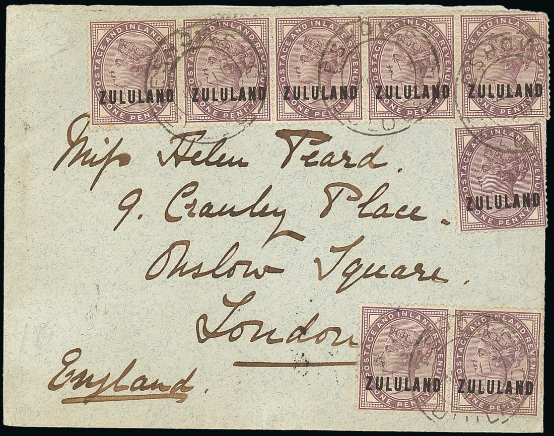 1890 (11 Mar.) double rate envelope (flap missing) to London, bearing 1d. lilac (8) cancelled by first type "eshowe/zululand" double-ring datestamps, Durban and South Kensington (8.4) c.d.s. on reverse; a couple of trivial imperfections to adhesives though an attractive and scarce franking. Photo