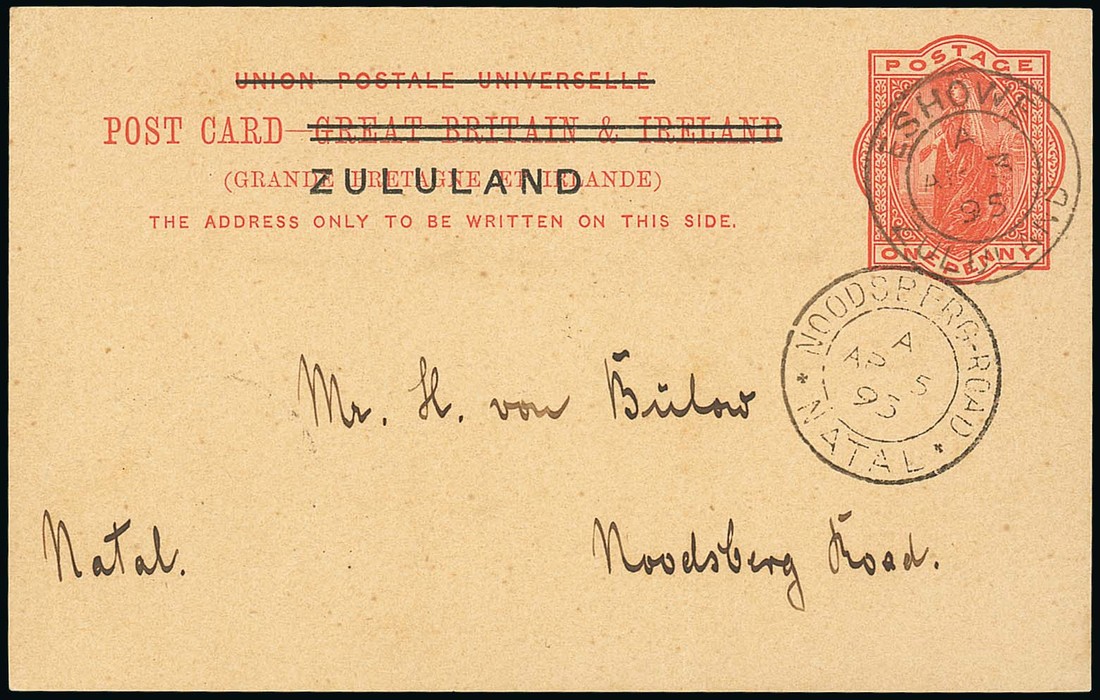 1896 (3 Apr.) 1d. card to Noodsberg Road, Natal, neatly cancelled by second type "eshowe/zululand" double-ring datestamp with time code "A", fine arrival c.d.s. (5.4) alongside; accompanied by 1892 5/- rose on small piece and cancelled by complete similar strike with code "P" - scarce. Photo