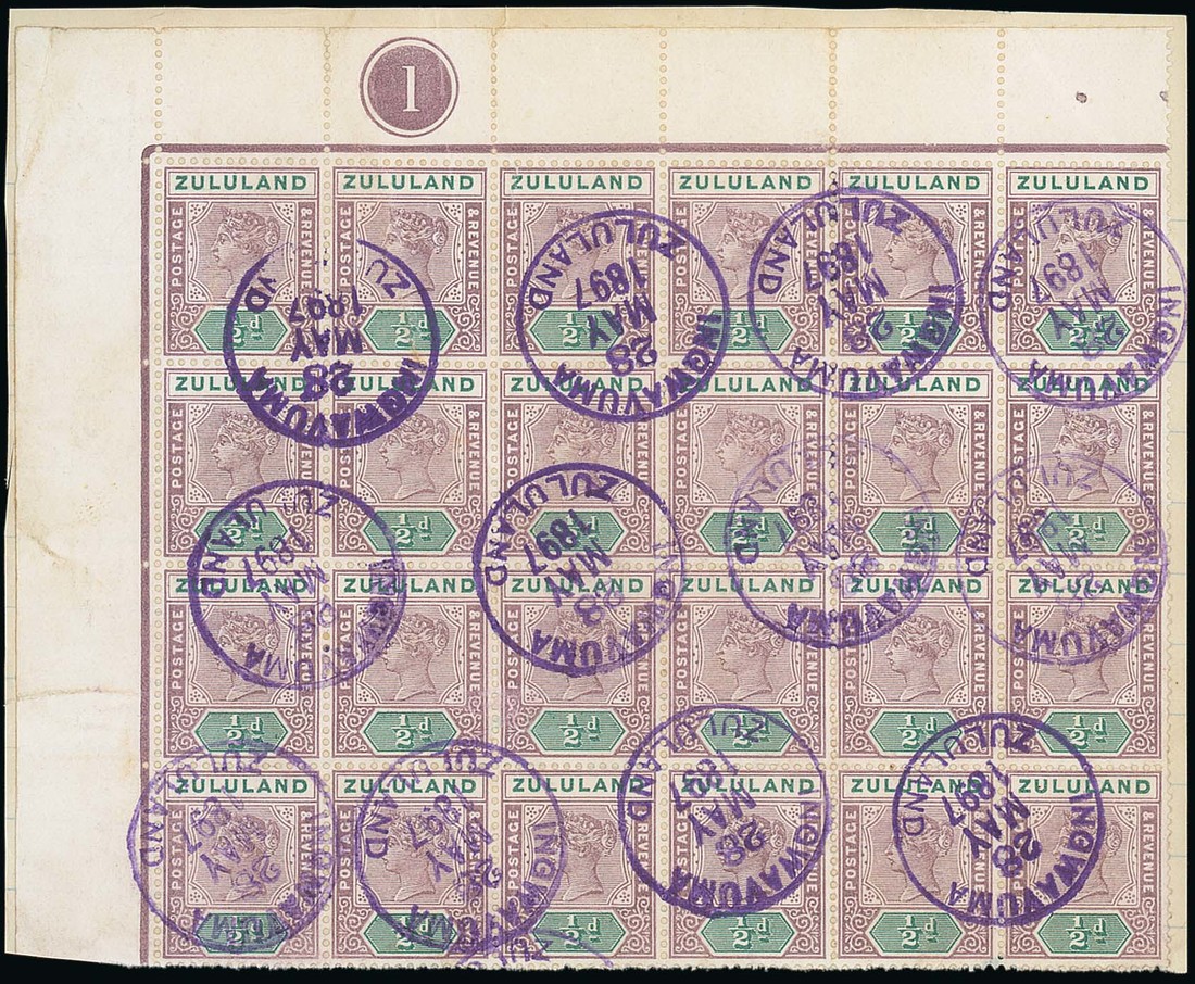 1894 ½d. dull mauve and green upper left corner plate block of twenty-four (6x4), Row 2/1 showing broken "n" in "zululand", affixed to piece and cancelled by twelve fine strikes of the "ingwavuma/zululand" rubber datestamp in violet for 28 May 1897; a couple of creases though a rare and impressive piece. Photo