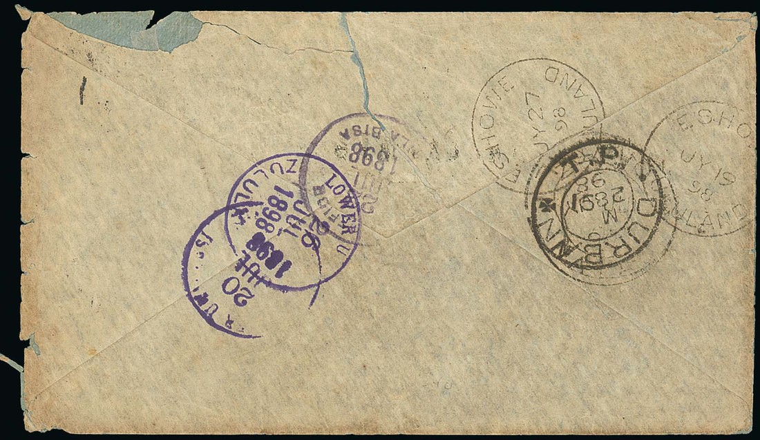 1898 (23 June) envelope from Maidstone to Hlabissu District, Embonbene", bearing 2½d. with c.d.s and showing "r.m. office/hlabisa" rubber datestamp below adhesive, the Zululand Post Office unable to deliver the cover and marked "Try G.P.O. Durban, Natal" in blue crayon at top with light Returned Letter Office natal c.d.s. below and framed "unclaimed" alongside, the reverse with Lower Unfolosi (20 and 26.7) and Hlabisa (22.70 rubber datestamps in violet, Eshowe (19 and 27.7), T.P.O. Natal and Durban (28.7) c.d.s.; perimeter faults mainly confined to reverse though an uncommon example of undelivered mail to Zululand. Photo