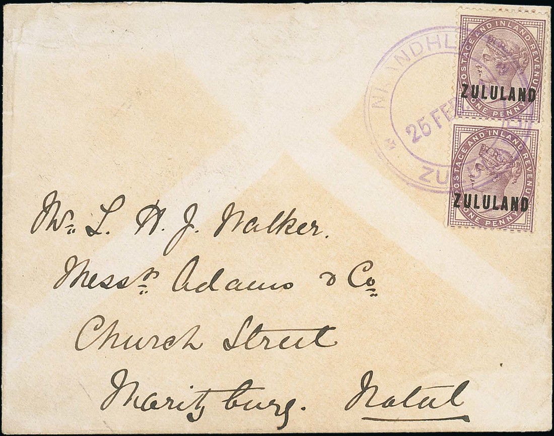 1891 (25 Feb.) envelope to Pietermaritzburg, bearing 1888 1d. lilac vertical pair sharing a fine strike of the "nkandhla/zululand" triple-ring rubber datestamp in violet, the reverse with Eshowe (27.2), Durban and G.P.O. Natal (2.3) datestamps; the face panel with tone marks from another envelope, otherwise fine and rare. Briefmarkenprüfstelle Certificate (2001). Photo