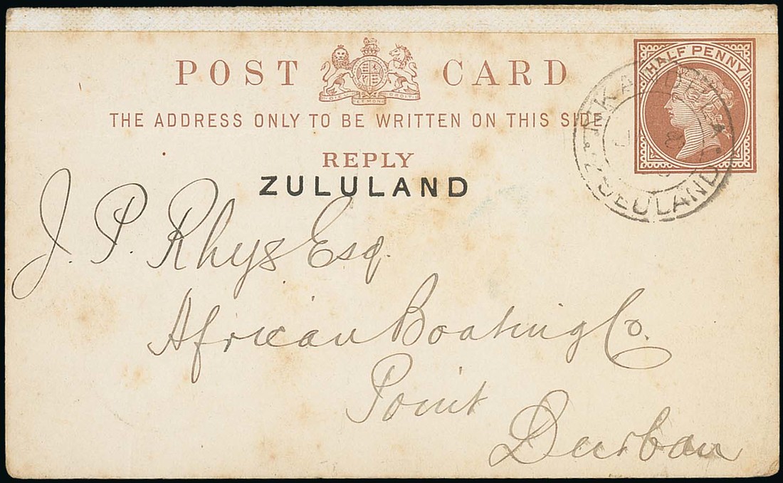 1898 (8 Jan.) reply portion of ½d. card, showing shaved "Z" variety, headed "Umhlatuzi Drift" to Point, Durban, cancelled by "nkandhla/zululand" double-ring datestamp, the reverse with Eshowe (10.1), Durban (11.1) and Point (11.1) datestamps; the odd trace of light tones though a rare genuinely used reply section card; also 1888 ½d. vermilion pair with part double-ring datestamp in violet. Photo
