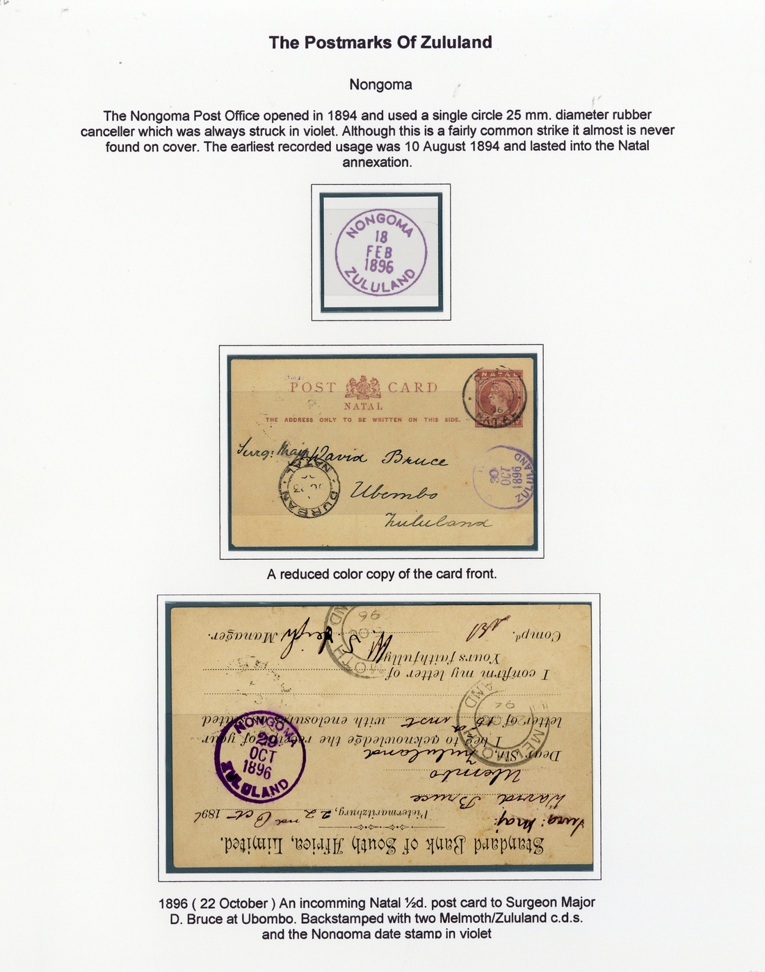 1896 (22 Oct.) Natal ½d. brown card used by the Standard Bank of South Africa at Pietermaritzburg to Sergeant-Major Bruce at Ubombo, cancelled by G.P.O. Natal double-ring datestamp and showing Durban (23.10) double-ring datestamp and indistinct rubber datestamp (30.10) in violet, probably Ubombo, below the stamp impression, the reverse with a fine strike of the "nongoma/zululand" rubber datestamp (29.10) in violet and two Melmoth c.d.s. (25.10)