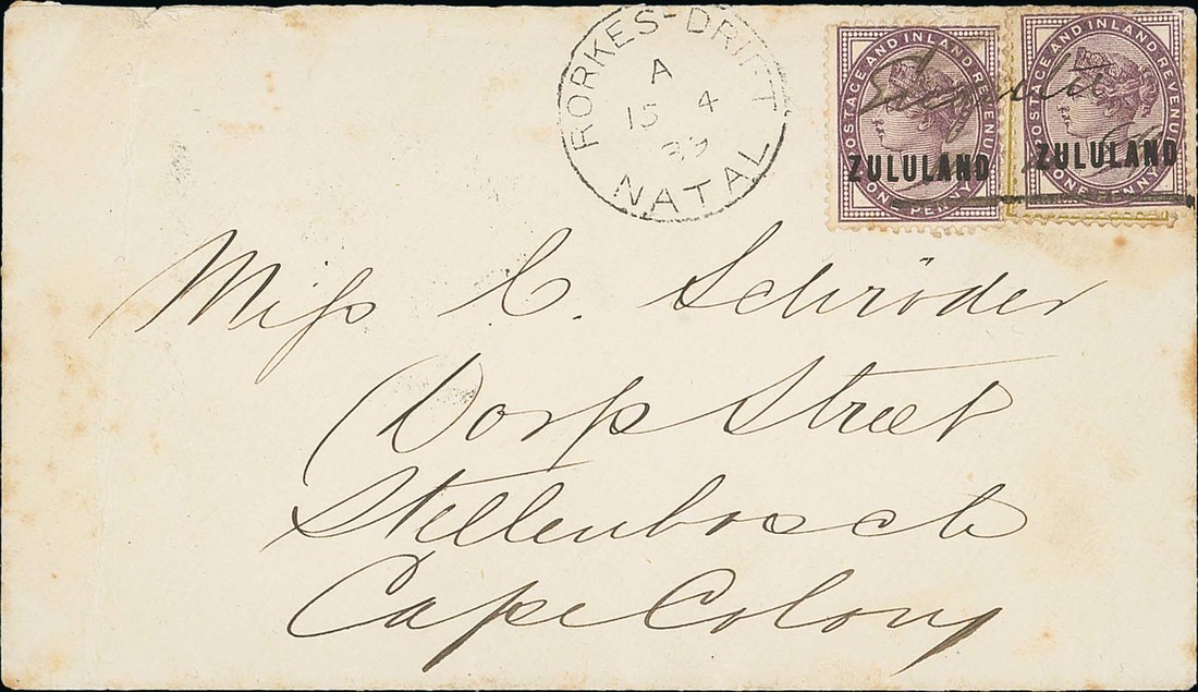 1889 (14 Apr.) envelope to Stellenbosch, Cape Colony, bearing 1888 1d. lilac (2, one affixed over Transvaal 2d.) sharing manuscript "Enqutu 14.4.89" and with "rorkes-drift/natal" datestamp (15.4) alongside, the reverse with G.P.O. Natal (16.4), Cape Town (22.4) and arrival (22.4) c.d.s.; vertical crease at left and some foxing virtually confined to reverse. The only example of this manuscript cancellation known on cover, and one of the gems of the collection. Photo