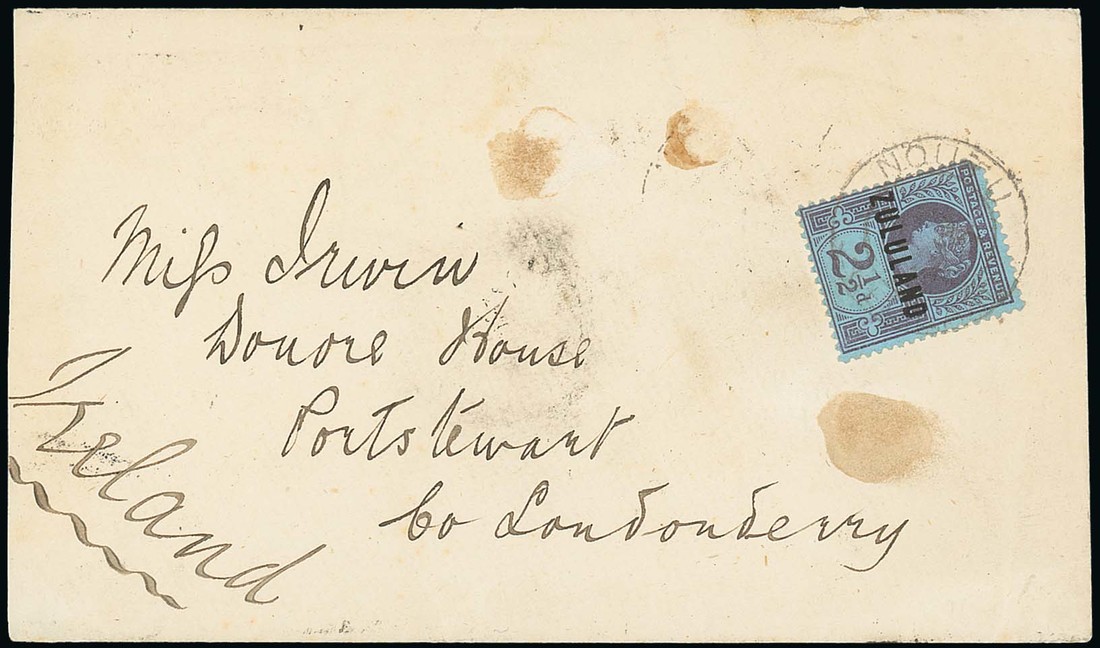 1894 (30 Apr.) envelope to Londonderry, Ireland, nearing 1888 2½d. purple on blue neatly cancelled by "nqutu/zululand" double-ring datestamp, two further despatch, Rorke's Drift Natal (30.4), G.P.O. Natal (1.5), Durban (1.5) and Port Stewart (23.5) datestamps; three small tone patches on face and fractionally truncated at left. Photo