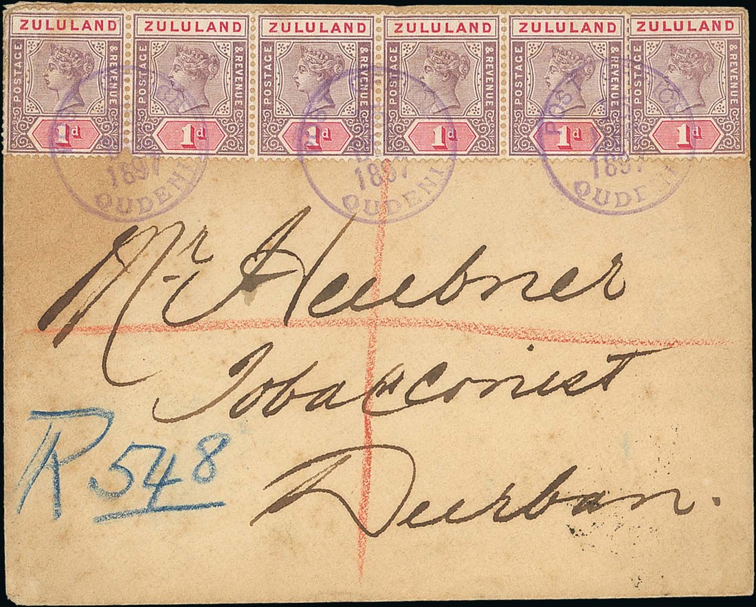 1897 (15 Dec.) envelope registered to Durban, bearing 1894 1d. dull mauve and carmine strip of five and a single cancelled by three fine strikes of the "post office/qudeni" rubber datestamp in violet and with manuscript "R548" in blue crayon at foot, the reverse with Nkandhla (18.12), Eshowe (20.12) and Durban (21.12) datestamps on reverse; traces of soiling though the sole cover recorded from this remote office. Photo