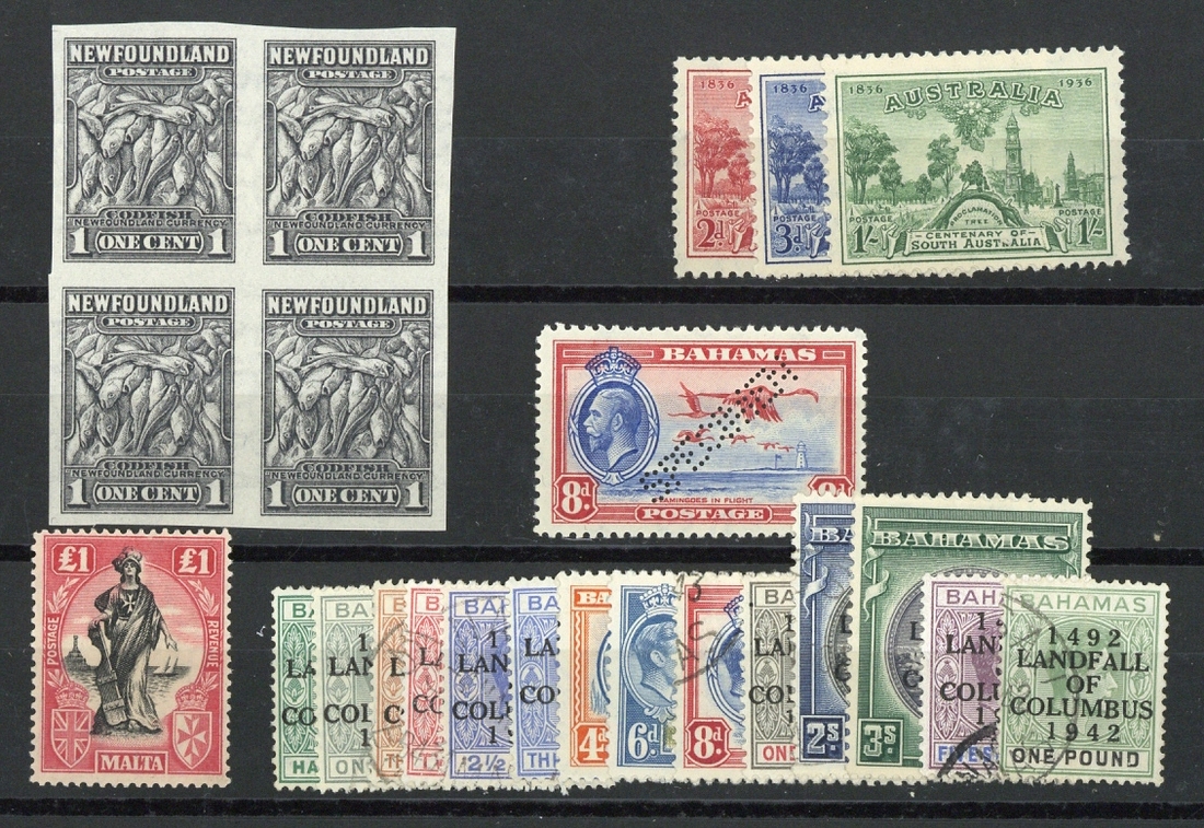 Small British Empire selection (40), including Bahamas 1935 8d. perforated "specimen", 1942 Landfall set used, Malta 1922-26 Melita £1 (watermark upright), Newfoundland 1932-38 1c. imperforate block of four, etc., chiefly fine