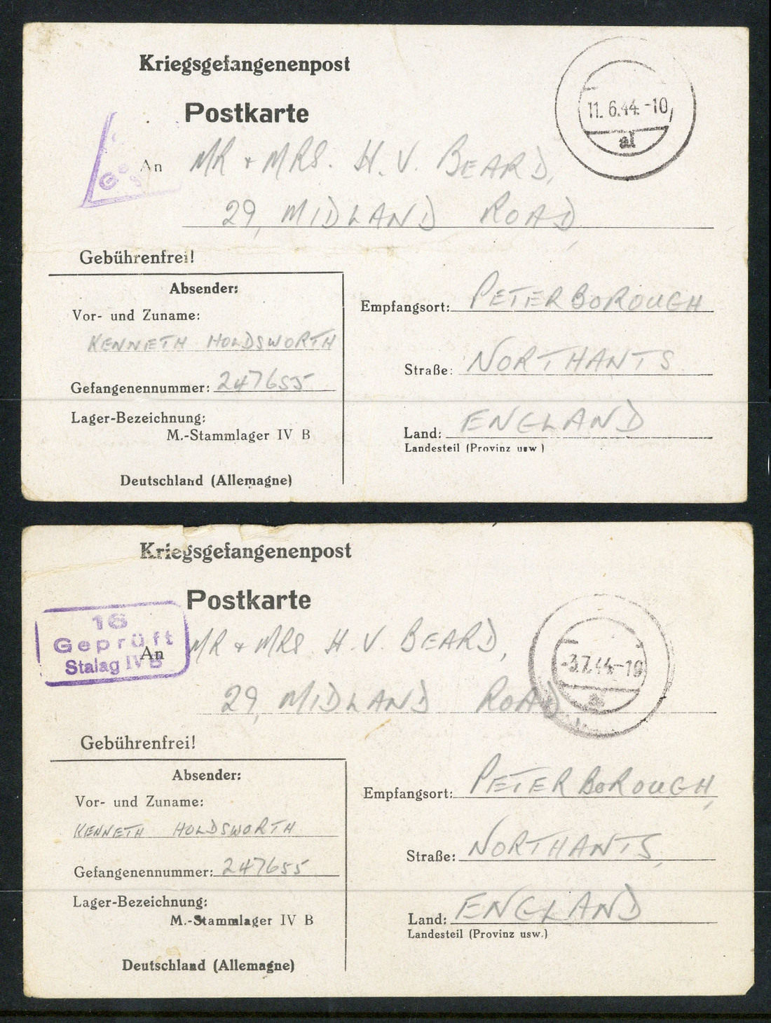 1941-45 a collection of Prisoner of War mail (50 items) between Sgt. Ken Holdsworth serving in the Middle East Force, and his sister in Peterborough. This includes special mail cards from Italian P.O.W. Camp 73 (7) and from Stalag IVB (20) in Germany. Also 1941 telegram, Airgraphs (7), two with boxed "it is regretted that /this item could not be/delivered because the/addressee is reported/prisoner of war", letters from Egypt and F.P.O's, a returned letter from the Army Post Office. Finally a group of items relating to the sister, Dorothy Beard and a few others including Italian P.O.W. in South Africa sent to Algeria. Generally fair to fine. Also Great Britain Inland Revenue 1837-1915 group of eight notices, mixed condition
