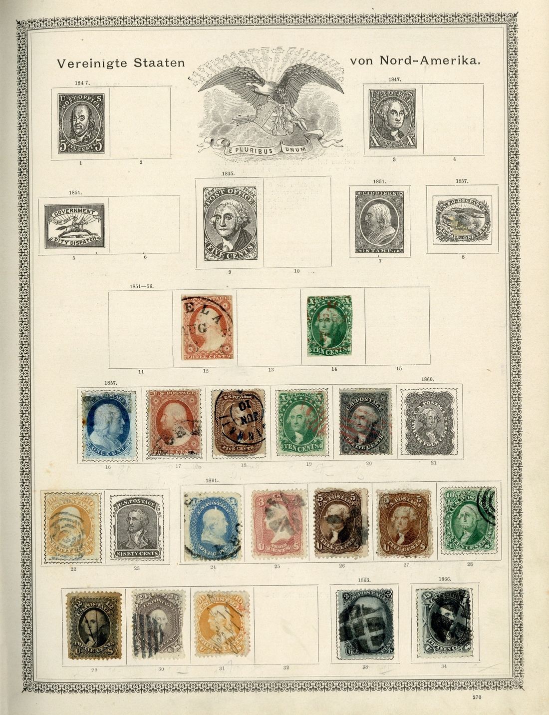 An All world collection housed in a Victorian era German printed album, strength in the Americas including better selections of Brazil, Chile and U.S.A. Condition somewhat mixed. (thousands)