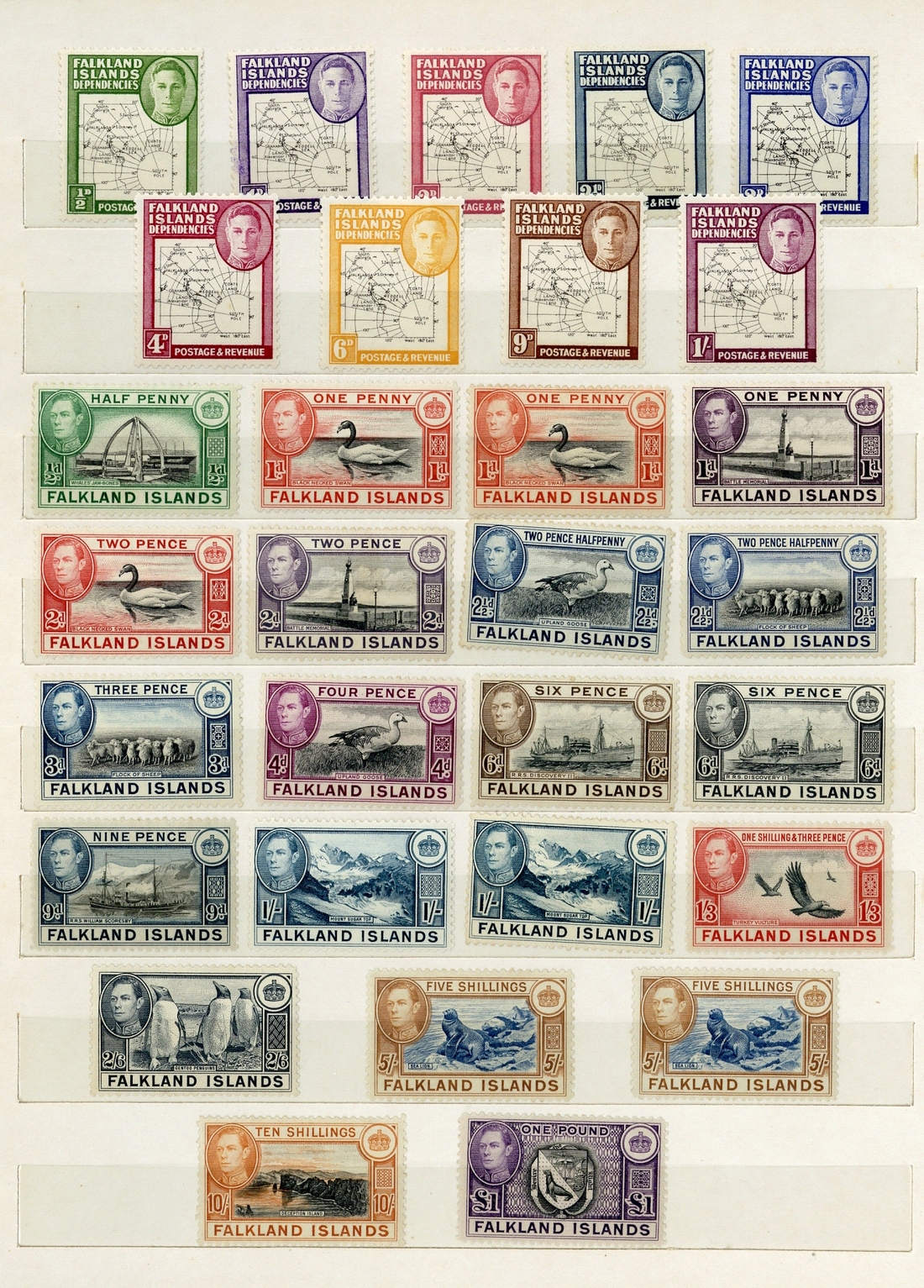 British Empire accumulation housed in twelve stockbooks and loose sheets, etc., contained in a carton, including mint Aden 1937 Dhows to 10r., additional values to 5r., 1939-40 to 10r.(3), Australia K.G.VI to £2, Ascension 1938-53 to 10/- with additional perfs. to 10/-, Bahamas 1884-90 £1, Bermuda 1924-32 10/-, Falkland Islands 1938--50 to £1 with additional 5/-, 1952 to £1, and Dependencies 1954 Ships to £1, Fiji 1938-55 to £1, Gibraltar 1938-51 to £1 with selected perf. varieties, Grenada 1938-50 to 1/- with additional 2/-, 5/- 10/- (5), K.U.T. 1938-54 to £1 and selected perf. varieties, Leeward Islands 1938-51 to £1 with additional £1 (2), Nigeria 1938-51 to 5/- with additional perf. varieties, North Borneo 1911 values to $5 used, 1931 to $2, Northern Rhodesia 1925-29 to 20/- with additional 7/6d., Nyasaland 1938-44 to £1 with additional £1 marginal block of four, Sarawak 1934-41 to $10, 1945 B.M.A. overprints to $4 (3) and values to $5 used. Condition mixed with some fine. An interesting lot worthy of closer inspection. (thousands)