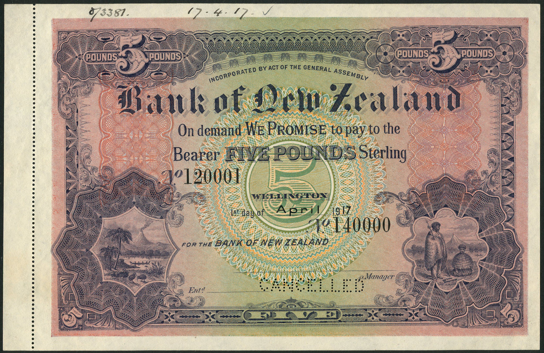 (†) Bank of New Zealand, printer's archival specimen £5, 1 April 1917, serial number run 120001 to 140000, perforated left edge, purple on green and pink underprint, two kiwis in rural scene at lower left, two Maoris at lower right, value in ornate guilloche at centre and in each corner, reverse blue on green, lilac and orange underprint, arms at top centre, value in guilloches in each corner, perforated CANCELLED