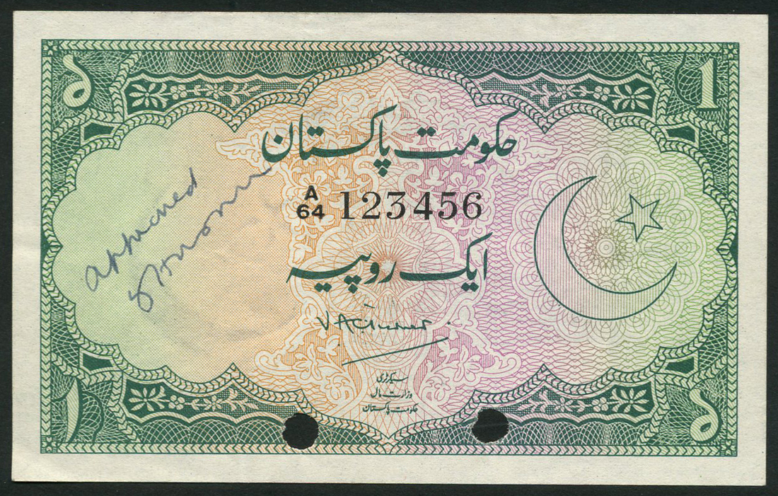 (†) Government of Pakistan, specimen proof 1 Rupee, ND (1949), specimen proof 1 Rupee, ND (1949), serial number A/64 123456, green on multicoloured underprint, crescent moon and star at right, value in each corner, reverse Naulakha Pavilion in Shah Qila, two punch holes