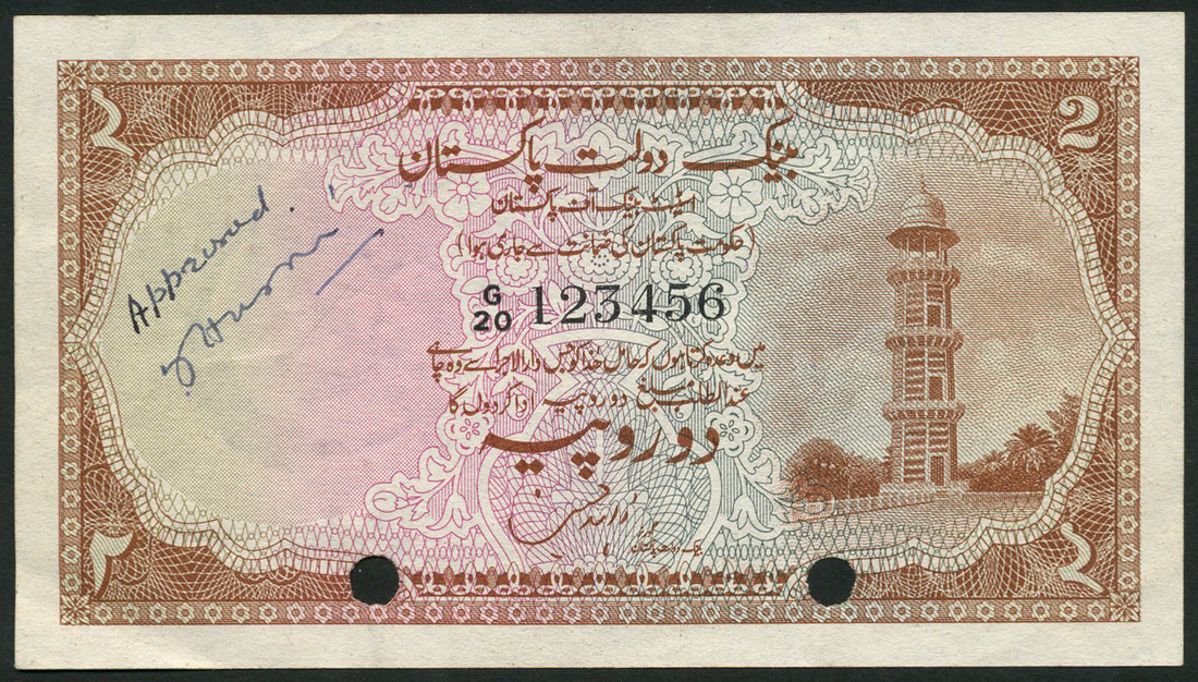(†) State Bank of Pakistan, specimen proof 2 Rupees, ND (1949), serial number G/20 123456, brown on pale green, blue and pink underprint, minaret at the tomb of Mughal Emperor Jahangir at right, value in each corner, reverse Badshahi mosque, Lahore, two punch holes