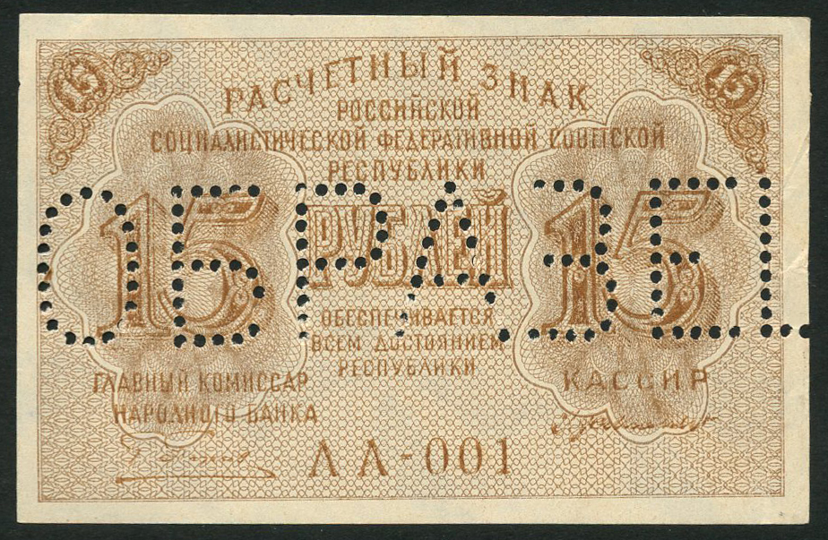 Russia, Currency notes, uniface obverse and reverse specimens for 15 rubles, ND 1919, serial number AA-001, brown on light brown underprint, values at left and right, reverse multicolour, coat of arms at centre flanked by values, perforated SPECIMEN
