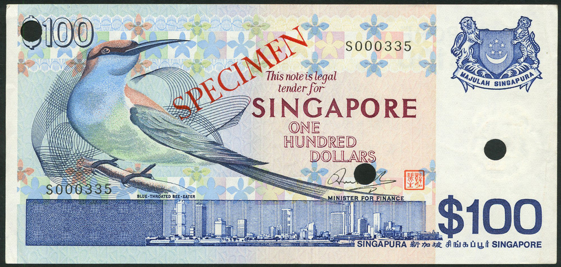 Board of Commissioners for Currency, Singapore, a partial specimen set for use in albums of the "bird" issues, ND (1976), comprising, $1, serial number S000276, $5, serial number S000296, and $100, serial number S000335, all feature colourful birds at left. Interestingly Tan states only 311 sets issued, but the $100 here has a higher serial