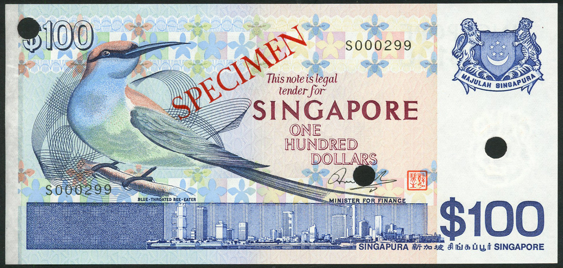 Board of Commissioners for Currency, Singapore specimen for use in album $100, ND (1989), serial number S000299, blue and multicolour, blue throated bee eater at left, coat of arms top right, view of Singapore low centre right, reverse, group of dancers