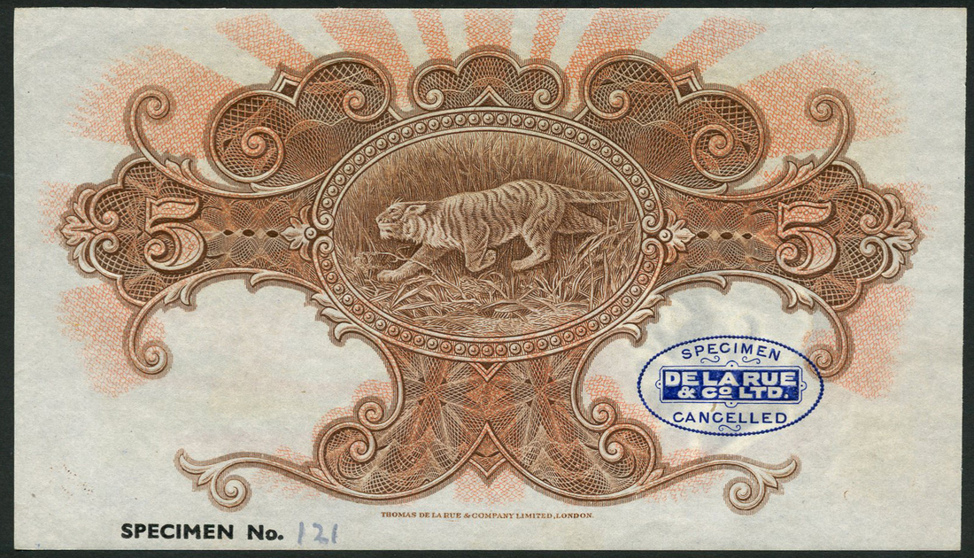 (†) Government of The Straits Settlements, printer's specimen colour trial proof 5 Dollars, ND (ca 1925), yellow and salmon-pink underprint only on obverse, reverse brown and pink, tiger in oval at centre, value at left and right, overprinted with one blue De La Rue specimen oval on reverse, SPECIMEN No. 121 at lower left