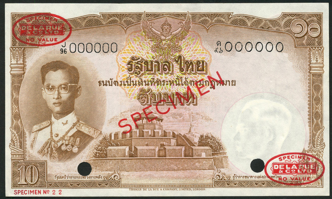 Government of Thailand, specimen 10 baht, ND (1953), serial number J/96 000000, brown, King Rama VIII at left, Mahagal Fortress at low centre, red SPECIMEN overprint ant De La Rue ovals, two cancellation holes