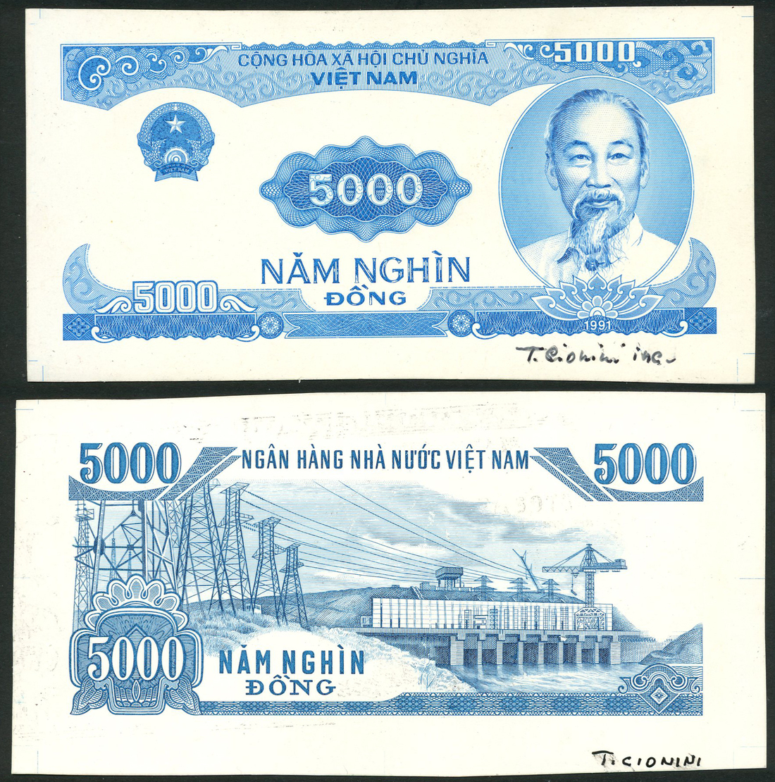 National Bank of Vietnam, an obverse and reverse die proof on thin card-like paper for a 5000 dong, ND (1991), blue and white, Ho Chi Minh at right, arms top left, reverse hydro-electric plant
