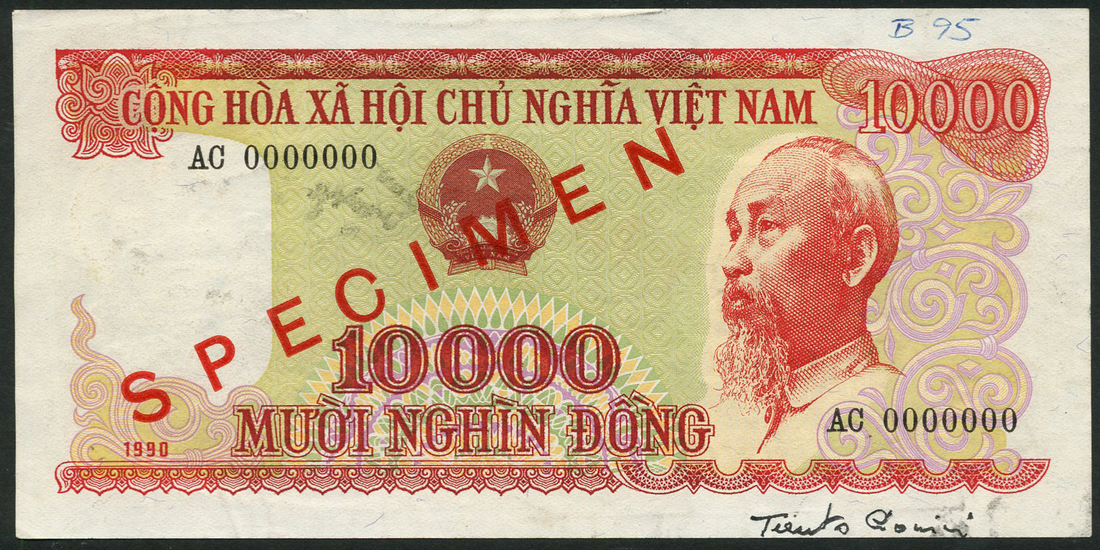 National Bank of Vietnam, specimen 10000 dong, 1990, serial number AC 0000000, red and green, Ho Chi Minh at right, arms at centre
