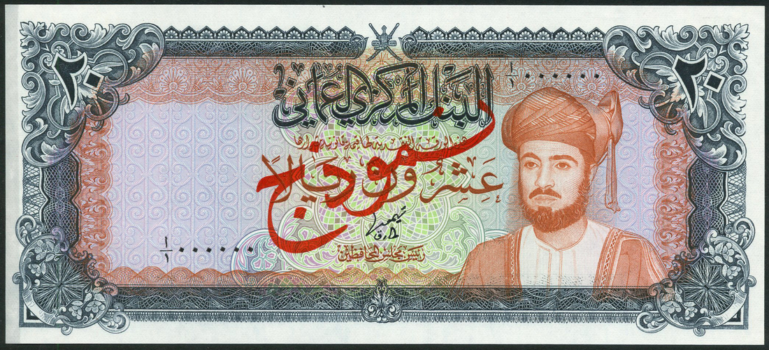 Central Bank of Oman, specimen 20 rials, ND (1982), serial A/1 000000, grey-blue and orange, Sultan Qaboos bin Said at right, reverse, Central Bank of Oman headquarters building