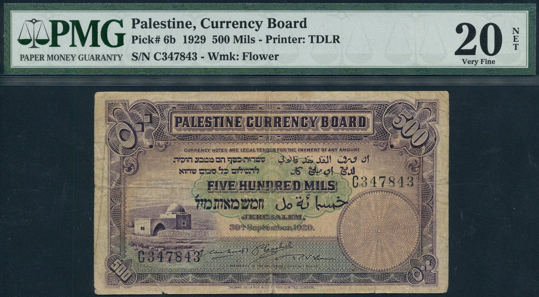 Palestine Currency Board, 500 mils, 1929, serial number C347843, purple and green, Rachel's tomb on the West Bank at low left, value in each corner and at centre, reverse, Tower of David at centre