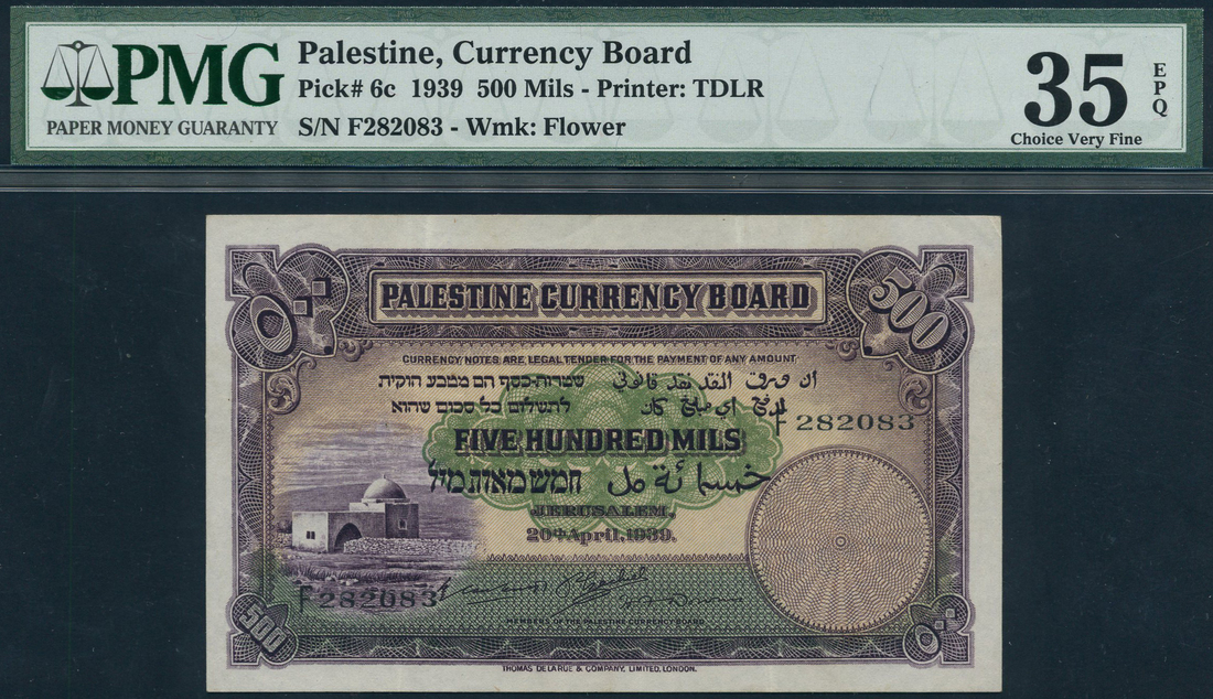 Palestine Currency Board, 500 mils, 20 April 1939, serial number F282083, purple and green, Rachel's tomb on the West Bank at low left, value in each corner and at centre, reverse, Tower of David at centre