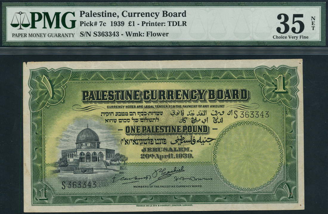 Palestine Currency Board, £1, 20 April 1939, serial number S363343, green, Dome of the Rock on Temple Mount in Jerusalem at left, value in each corner and at centre, reverse, Tower of David citadel